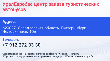 УралЕвробас, центр заказа туристических автобусов по адресу 620027, Свердловская область, Екатеринбург, Челюскинцев, 106 в дальнейшем Организация, размещена в следующих категориях: