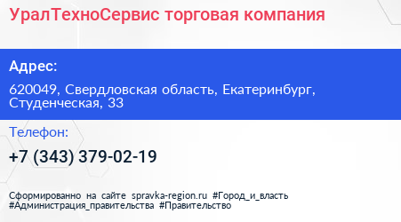 УралТехноСервис, торговая компания по адресу 620049, Свердловская область, Екатеринбург, Студенческая, 33 в дальнейшем Организация, размещена в следующих категориях: