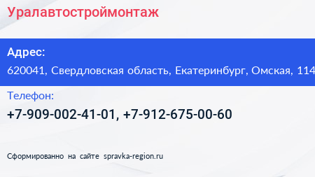 Уралавтостроймонтаж по адресу 620041, Свердловская область, Екатеринбург, Омская, 114 в дальнейшем Организация, размещена в следующих категориях: