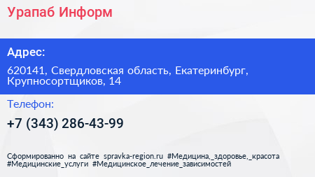 Урапаб-Информ по адресу 620141, Свердловская область, Екатеринбург, Крупносортщиков, 14 в дальнейшем Организация, размещена в следующих категориях: