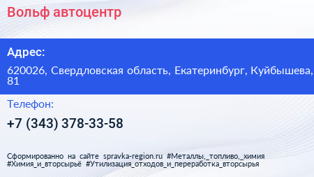 Вольф, автоцентр по адресу 620026, Свердловская область, Екатеринбург, Куйбышева, 81 в дальнейшем Организация, размещена в следующих категориях: