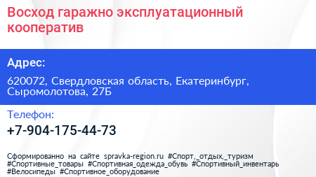 Восход, гаражно-эксплуатационный кооператив по адресу 620072, Свердловская область, Екатеринбург, Сыромолотова, 27Б в дальнейшем Организация, размещена в следующих категориях: