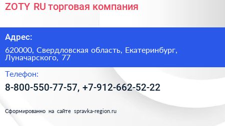 ZOTY.RU, торговая компания по адресу 620000, Свердловская область, Екатеринбург, Луначарского, 77 в дальнейшем Организация, размещена в следующих категориях: