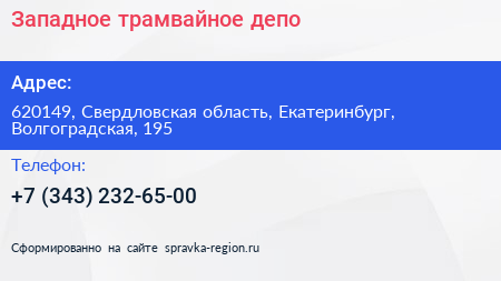 Западное трамвайное депо по адресу 620149, Свердловская область, Екатеринбург, Волгоградская, 195 в дальнейшем Организация, размещена в следующих категориях: