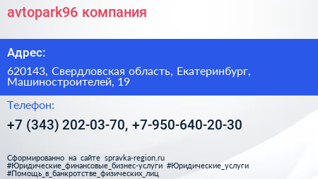 avtopark96, компания по адресу 620143, Свердловская область, Екатеринбург, Машиностроителей, 19 в дальнейшем Организация, размещена в следующих категориях: