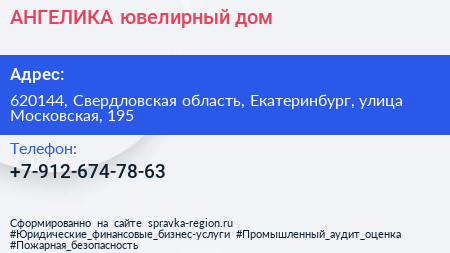 АНГЕЛИКА, ювелирный дом по адресу 620144, Свердловская область, Екатеринбург, улица Московская, 195 в дальнейшем Организация, размещена в следующих категориях: