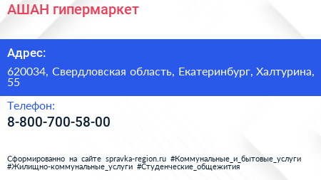 АШАН, гипермаркет по адресу 620034, Свердловская область, Екатеринбург, Халтурина, 55 в дальнейшем Организация, размещена в следующих категориях: