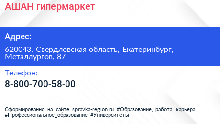 АШАН, гипермаркет по адресу 620043, Свердловская область, Екатеринбург, Металлургов, 87 в дальнейшем Организация, размещена в следующих категориях: