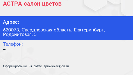 АСТРА, салон цветов по адресу 620073, Свердловская область, Екатеринбург, Родонитовая, 5 в дальнейшем Организация, размещена в следующих категориях: