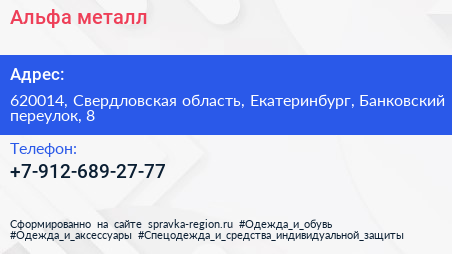 Альфа металл по адресу 620014, Свердловская область, Екатеринбург, Банковский переулок, 8 в дальнейшем Организация, размещена в следующих категориях: