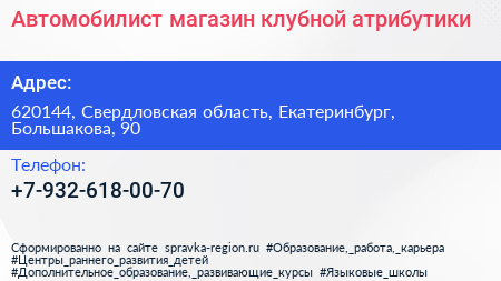 Автомобилист, магазин клубной атрибутики по адресу 620144, Свердловская область, Екатеринбург, Большакова, 90 в дальнейшем Организация, размещена в следующих категориях: