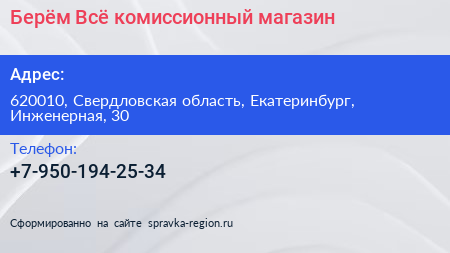 Берём Всё, комиссионный магазин по адресу 620010, Свердловская область, Екатеринбург, Инженерная, 30 в дальнейшем Организация, размещена в следующих категориях: