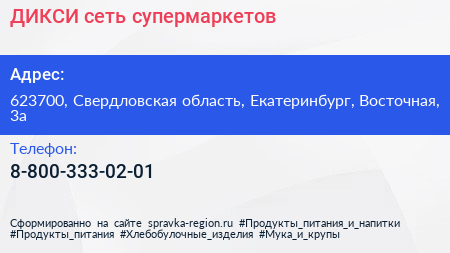 ДИКСИ, сеть супермаркетов по адресу 623700, Свердловская область, Екатеринбург, Восточная, 3а в дальнейшем Организация, размещена в следующих категориях: