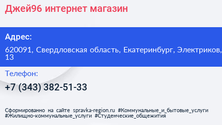 Джей96, интернет-магазин по адресу 620091, Свердловская область, Екатеринбург, Электриков, 13 в дальнейшем Организация, размещена в следующих категориях: