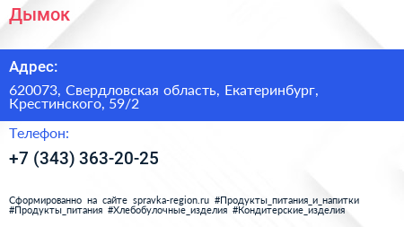 Дымок по адресу 620073, Свердловская область, Екатеринбург, Крестинского, 59/2 в дальнейшем Организация, размещена в следующих категориях: