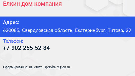 Елкин дом, компания по адресу 620085, Свердловская область, Екатеринбург, Титова, 29 в дальнейшем Организация, размещена в следующих категориях: