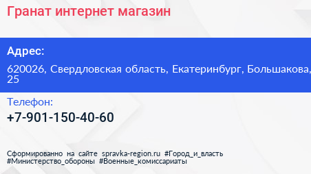 Гранат, интернет-магазин по адресу 620026, Свердловская область, Екатеринбург, Большакова, 25 в дальнейшем Организация, размещена в следующих категориях: