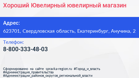 Хороший Ювелирный, ювелирный магазин по адресу 623701, Свердловская область, Екатеринбург, Анучина, 2 в дальнейшем Организация, размещена в следующих категориях: