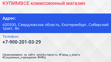 КУПИМВСЕ, комиссионный магазин по адресу 620100, Свердловская область, Екатеринбург, Сибирский тракт, 8н в дальнейшем Организация, размещена в следующих категориях: