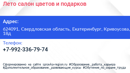 Лето, салон цветов и подарков по адресу 624091, Свердловская область, Екатеринбург, Кривоусова, 18д в дальнейшем Организация, размещена в следующих категориях: