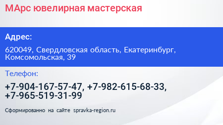 МАрс, ювелирная мастерская по адресу 620049, Свердловская область, Екатеринбург, Комсомольская, 39 в дальнейшем Организация, размещена в следующих категориях: