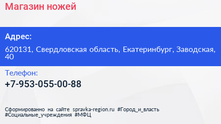 Магазин ножей по адресу 620131, Свердловская область, Екатеринбург, Заводская, 40 в дальнейшем Организация, размещена в следующих категориях: