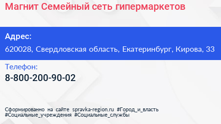 Магнит Семейный, сеть гипермаркетов по адресу 620028, Свердловская область, Екатеринбург, Кирова, 33 в дальнейшем Организация, размещена в следующих категориях: