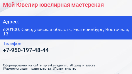 Мой Ювелир, ювелирная мастерская по адресу 620100, Свердловская область, Екатеринбург, Восточная, 13 в дальнейшем Организация, размещена в следующих категориях:
