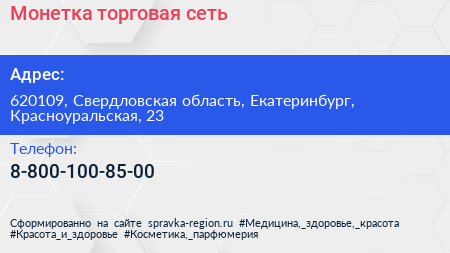 Монетка, торговая сеть по адресу 620109, Свердловская область, Екатеринбург, Красноуральская, 23 в дальнейшем Организация, размещена в следующих категориях: