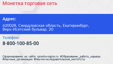 Монетка, торговая сеть по адресу 620028, Свердловская область, Екатеринбург, Верх-Исетский бульвар, 20 в дальнейшем Организация, размещена в следующих категориях: