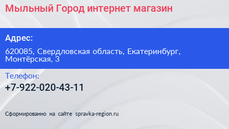 Мыльный Город, интернет-магазин по адресу 620085, Свердловская область, Екатеринбург, Монтёрская, 3 в дальнейшем Организация, размещена в следующих категориях: