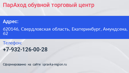 ПарАход, обувной торговый центр по адресу 620146, Свердловская область, Екатеринбург, Амундсена, 62 в дальнейшем Организация, размещена в следующих категориях: