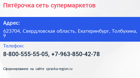 Пятёрочка, сеть супермаркетов по адресу 623704, Свердловская область, Екатеринбург, Толбухина, 9 в дальнейшем Организация, размещена в следующих категориях: