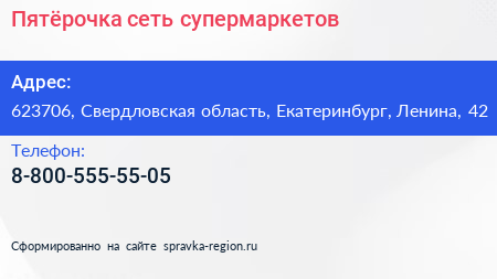 Пятёрочка, сеть супермаркетов по адресу 623706, Свердловская область, Екатеринбург, Ленина, 42 в дальнейшем Организация, размещена в следующих категориях: