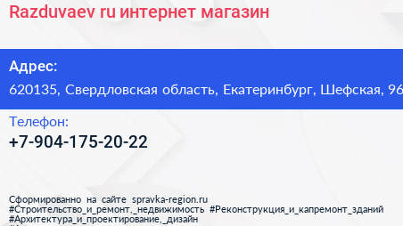Razduvaev.ru, интернет-магазин по адресу 620135, Свердловская область, Екатеринбург, Шефская, 96 в дальнейшем Организация, размещена в следующих категориях: