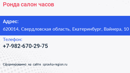Ронда, салон часов по адресу 620014, Свердловская область, Екатеринбург, Вайнера, 10 в дальнейшем Организация, размещена в следующих категориях: