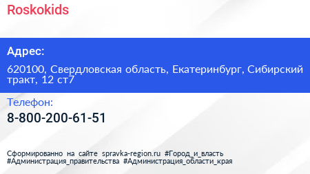 Roskokids по адресу 620100, Свердловская область, Екатеринбург, Сибирский тракт, 12 ст7 в дальнейшем Организация, размещена в следующих категориях: