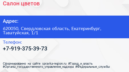 Салон цветов по адресу 620050, Свердловская область, Екатеринбург, Таватуйская, 1/1 в дальнейшем Организация, размещена в следующих категориях: