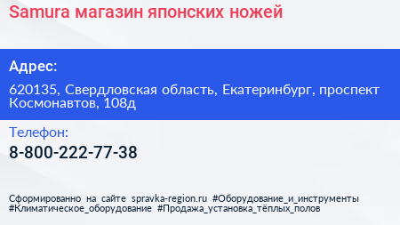 Samura, магазин японских ножей по адресу 620135, Свердловская область, Екатеринбург, проспект Космонавтов, 108д в дальнейшем Организация, размещена в следующих категориях: