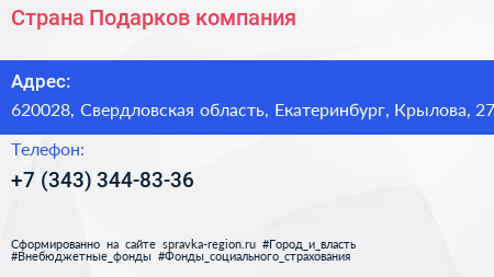 Страна Подарков, компания по адресу 620028, Свердловская область, Екатеринбург, Крылова, 27 в дальнейшем Организация, размещена в следующих категориях: