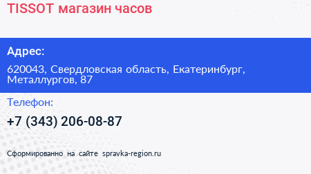 TISSOT, магазин часов по адресу 620043, Свердловская область, Екатеринбург, Металлургов, 87 в дальнейшем Организация, размещена в следующих категориях: