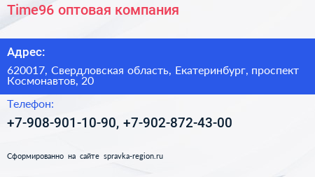 Time96, оптовая компания по адресу 620017, Свердловская область, Екатеринбург, проспект Космонавтов, 20 в дальнейшем Организация, размещена в следующих категориях: