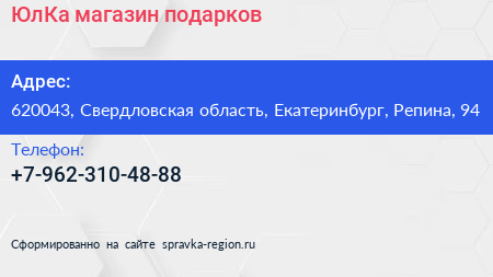 ЮлКа, магазин подарков по адресу 620043, Свердловская область, Екатеринбург, Репина, 94 в дальнейшем Организация, размещена в следующих категориях: