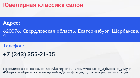 Ювелирная классика, салон по адресу 620076, Свердловская область, Екатеринбург, Щербакова, 4 в дальнейшем Организация, размещена в следующих категориях: