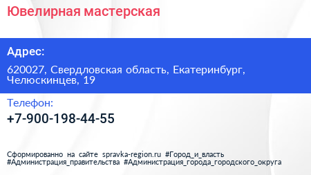 Ювелирная мастерская по адресу 620027, Свердловская область, Екатеринбург, Челюскинцев, 19 в дальнейшем Организация, размещена в следующих категориях: