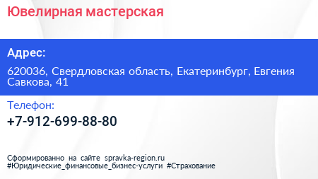 Ювелирная мастерская по адресу 620036, Свердловская область, Екатеринбург, Евгения Савкова, 41 в дальнейшем Организация, размещена в следующих категориях: