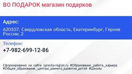 ВО! ПОДАРОК, магазин подарков по адресу 620107, Свердловская область, Екатеринбург, Героев России, 2 в дальнейшем Организация, размещена в следующих категориях: