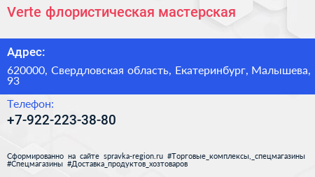 Verte, флористическая мастерская по адресу 620000, Свердловская область, Екатеринбург, Малышева, 93 в дальнейшем Организация, размещена в следующих категориях:
