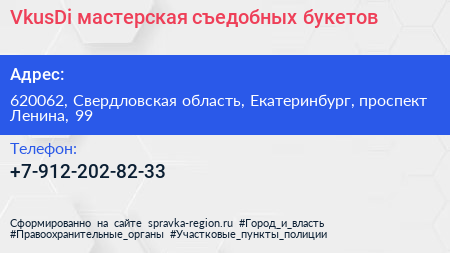 VkusDi, мастерская съедобных букетов по адресу 620062, Свердловская область, Екатеринбург, проспект Ленина, 99 в дальнейшем Организация, размещена в следующих категориях: