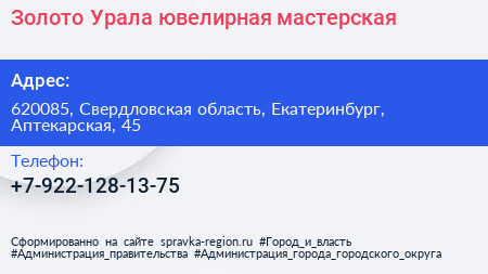 Золото Урала, ювелирная мастерская по адресу 620085, Свердловская область, Екатеринбург, Аптекарская, 45 в дальнейшем Организация, размещена в следующих категориях: